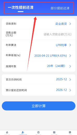 4、如需提前还款,选择一次性还清或部分还清模式,设置相关参数即可查看调整后的还款计划。
