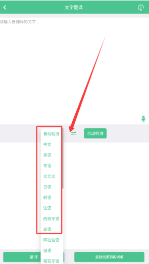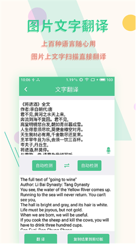 3、图片文字翻译,拍摄图片设置语言,马上就能翻译,翻译的文字可以粘贴到剪贴板导出;