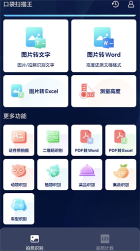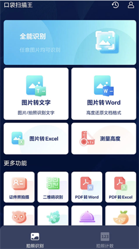 口袋扫描王吾爱破解版是由成都科技公司推出的一款功能强大的智能扫描软件,快速扫描文本文档,可以将照片和课本转化为电子文档,聚焦扫描处理核心需求,整合AI识别、格式转换、计数测量、图片美化等功能,为用户提供高效便捷的解决方案。可以帮助你轻松扫描电子文件。界面清爽简洁,功能齐全,涵盖文件扫描、图片文字提取识别、图片内容识别、图片转Word、图片转excel、拍照计数、AI美图等多种功能,满足不同用户的需求。软件操作简单,毕竟可以采用智能OCR识别文字,还支持拍照识别,一秒帮你轻松识别照片中的植物、动物、车型以及蔬菜水果等物品。除了以上功能外,口袋扫描王官方版还新增了全新的AI美图功能,基于智能的AI算法,为你生成时下最火爆,最经典的漫画图片、名画图片等,所以大家还在等什么,感兴趣的小伙伴赶快来下载体验吧。
