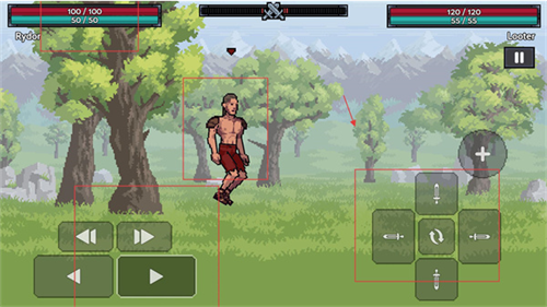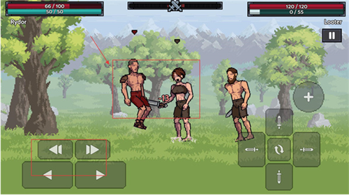 1、战斗界面左侧是移动按钮,右侧是攻击相关功能键,顶部显示双方的生命值与耐力值,利用右侧攻击键发起进攻,同时留意自身状态。