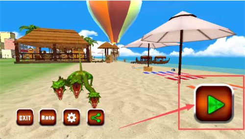 1、画面显示热带沙滩场景,远处有茅草屋和水滑梯,近处趴着三头绿龙,上方有热气球,左下角四个按钮,右侧红框标注的橙色播放按钮,点这个按钮开始游戏。