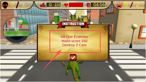 4、画面显示城市街道,绿色恐龙站在路上,上方有骷髅头红心时钟汽车图标和数字,中间棕色提示框写着任务要求,下方带对勾按钮被红箭头指着,点这个按钮确认任务。