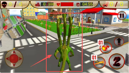 3、画面显示城市街道场景,绿色多触手怪物站在路上,两旁有房屋和路灯,上方显示生命值时间等数据,左上角小地图,右下角攻击按钮,怪物被红框圈出,按照提示操作攻击。