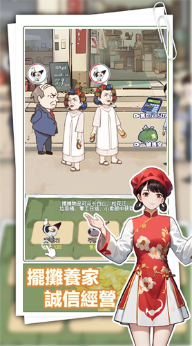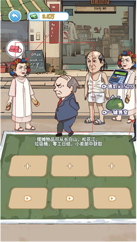 2、摆摊场景中可将货仓物品放置在摊位格子中售卖,物品可从长白山、垃圾桶等场景获取,界面还支持一键售空快速变现。