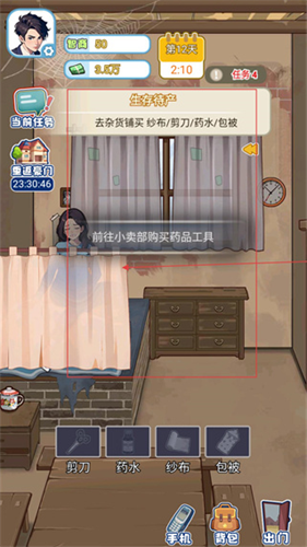 3、当前任务是去杂货铺购买纱布、剪刀、药水、包被,需点击出门前往小卖部场景,这些物品是生存待产任务的必备道具。