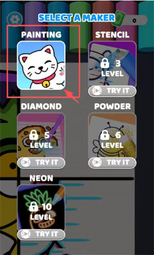 2、在材料选择界面,上方写着SELECT A MAKER,看到红色方框圈住了PAINTING区域的招财猫图案,点一下这个被框住的图案,就能选择绘画工具了。