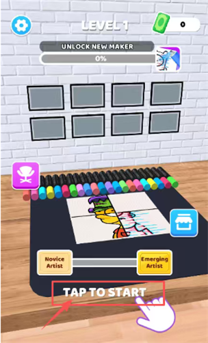 1、在游戏关卡界面,看到底部红色框和手指图标都指向TAP TO START区域,点一下这个区域,就可以开始你的第一关绘画挑战了。
