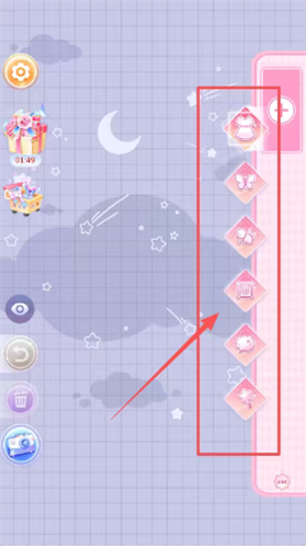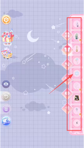 2、进入游戏编辑界面,看到右边粉色竖条上有很多物品图标,红色箭头指着其中一个图标,点一下这个被指着的图标,就能把它放进你的画面里了。