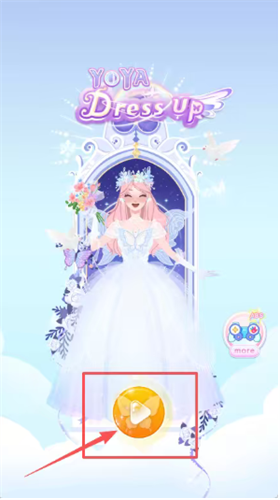 1、在游戏启动界面,看到右下角橙色播放按钮被红框和箭头标出,点一下这个橙色按钮,就能开始玩YOYA Dress up这个换装游戏了。