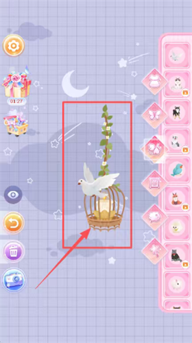 4、看到画面中间有一只白鸽站在棕色鸟笼上,红色方框和箭头都圈着它,点一下这个鸽子或者鸟笼,就能选中它,之后可以移动、缩放或者更换它。