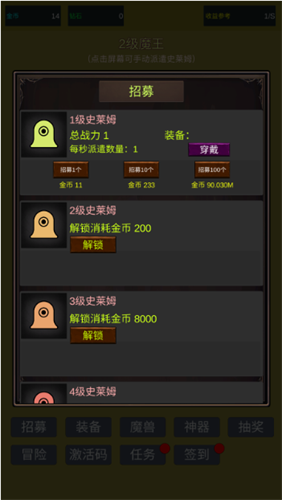 3、在招募界面可以花费金币解锁更高级别的史莱姆。