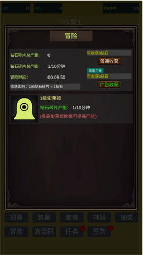 4、通过冒险获取钻石,钻石可以用来抽取魔兽,装备和神器,增强史莱姆的实力。