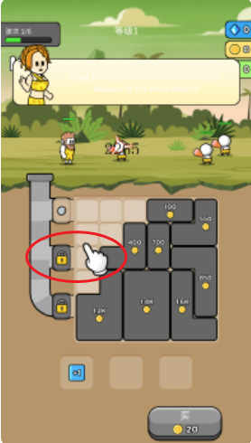 游戏开始时,英雄会自动攻击,击败敌人可获得金币。优先攒金币购买方块,将其与初始武器合并,提升攻击力,快速消灭敌人,为后续关卡积累资源和优势。