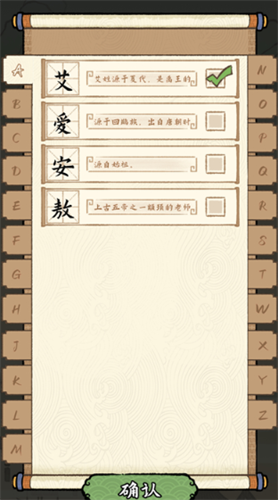 2、点击方框后进入姓氏选择界面,在这里可以寻找自己的姓氏进行发展;
