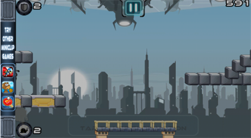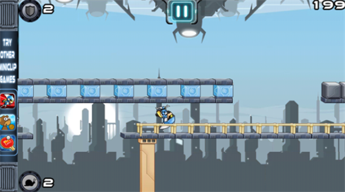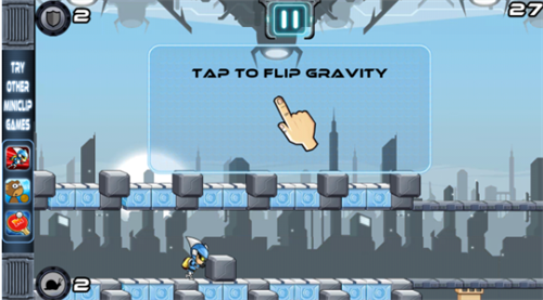 游戏类型有点像反重力跑酷。屏幕的左下角有一个按钮,这个按钮可以让时空变得缓慢,我们更不容易犯错误。