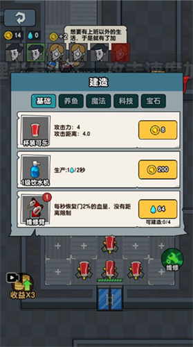找好办公室后优先提升床的等级和建造两个炮台,因为这个时候老板还没有到来,所以优先提升计算机的等级快速获取金币,然后再去提升门的等级,之后计算机的等级可以暂停一下,优先提升门的等级,否则很容易被老板突破,提升到需要电力的时候再去商店购买游戏机,否则会很容易被老板突破;