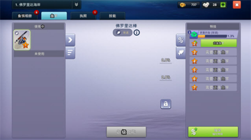 6、点击左侧的装备按键即可查看当前装备的钓竿,还可以在这个界面升级钓竿的能力。