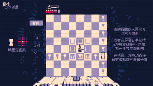 2、策略与射击:每一回合,你可以选择移动你的国王或射击敌人的棋子。之后,你需要再次移动来给霰弹枪装弹。避免被对方将死,同时寻找机会杀死敌方的王,完成每一层的关卡挑战。
