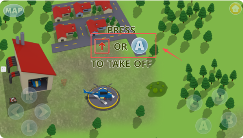 3、起飞操作很简单,找到画面中的“A”按键或按屏幕提示“PRESS OR A TO TAKE OFF”,直升机就能从停机坪升空。背景有房屋和树木。