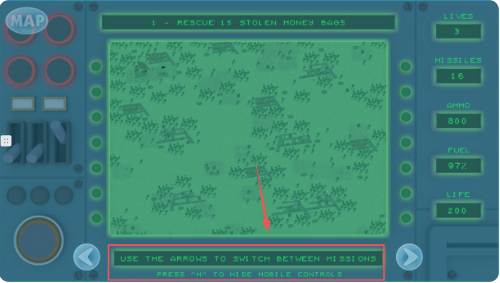 4、游戏进行时,界面右侧会显示生命值、导弹、弹药和燃料数据,左侧有地图等功能按钮。可用箭头键切换任务。