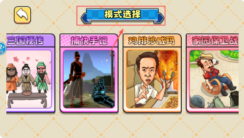 2、接着来到模式选择界面,这里有四种游戏,比如三国梗传或鸡排沙威玛,点击你喜欢的图标进入哦。
