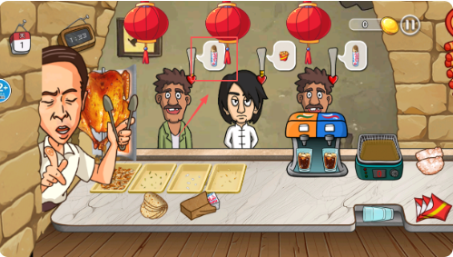 4、客流量随游戏进程逐渐递增,必须熟练运用全部烹饪技巧进行高效制作,以应对持续增长的服务压力。