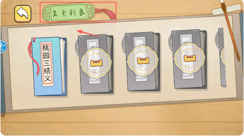 3、选模式后可能看到关卡列表,灰色书册是未解锁,蓝色如“桃园三结义”可点击开启,开启后就能玩啦。