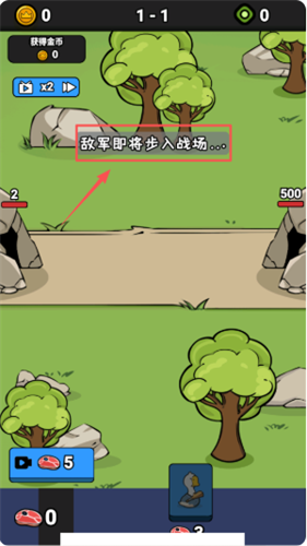 2、进入战场后,留意上方的比分和金币数量,同时注意“敌军即将步入战场…”的提示,这表示你需要提前做好准备。
