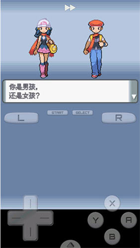 2、点击触摸屏上的精灵球,选择男生或者女生作为自己操纵的主角,而未被选择的一方将成为主角的对手。