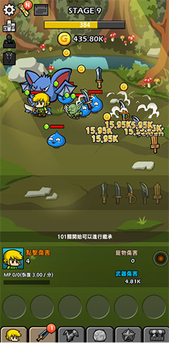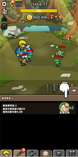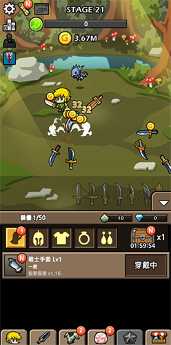 以上介绍了该游戏的主要作战形式,当然前面我们也说到了,前期都是靠手动刷怪才能积累起购买自动攻击的武器,因此在这里,点击人物头像便可进入到角色画面,在这里你可升级角色等级,从而增加每次点击时的角色的攻击威力,再而通过购买不同历代的名剑,以获取高额的点击伤害,这些也都是可以升级强化的哦。另外,玩家还能养育各种精灵小宠物和开发各种装甲防御哦。