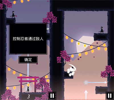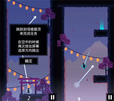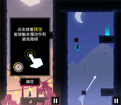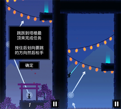 1、按住屏幕后,再划向要跳的方向,然后松手,忍者即可朝该方向冲刺。
