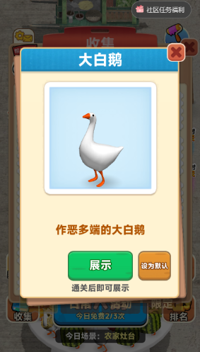 每日惊喜活动:限时开放“抓娃娃”“地域美食”主题关卡,通关可获限定大鹅皮肤。
