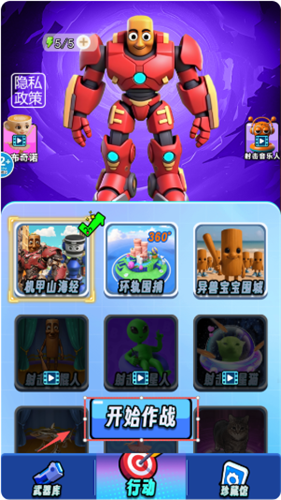 1、启动游戏后,中心是红色机器人。左上角关注能量条5/5.底部有“武器库”、“行动”等按钮,核心操作是点击中间的“开始作战”按钮来选择。
