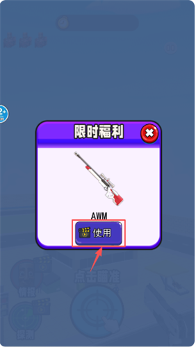 2、遇到“限时福利”弹窗时,注意看中央的AWM狙击枪奖励。想领取就点击枪下方蓝色的“使用”按钮,若不需要则点击右上角的红叉关闭弹窗。