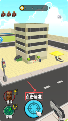4、游戏过程中,留意屏幕上方的倒计时和分数。瞄准和射击使用右下角的“点击瞄准”,左下角的“情报”和“探测”按钮可帮你获取战场信息。
