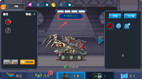 1、进入主界面后,可以先看看左侧的坦克属性如生命值,并点击右侧技能或飞行器进行了解,接着按下“升级”按钮来提升坦克等级。