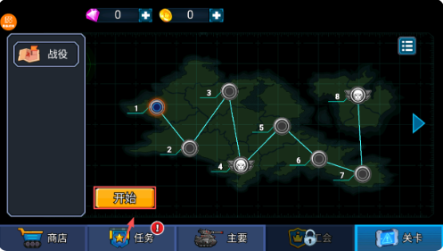 4、准备战斗时,在主地图选择带骷髅标志的节点,确认左侧“战役”信息后,点击底部显眼的黄色“开始”按钮就能进行游戏了。