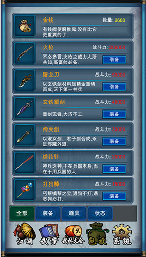 包括火枪、屠龙刀等近30种武器,可增加武力。