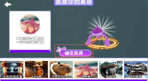 3、进入角色选择界面时,你会看到很多独特角色,比如跑鞋鲨或卡皮巴拉,滑动下方图标可以预览,点击确定选择就能锁定。