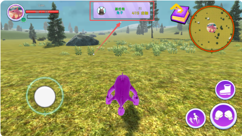 4、游戏开始后,注意屏幕中间的任务提示,比如追捕兔子能获得经验。使用左下角的摇杆控制移动,右侧紫色按钮负责跳跃和攻击。