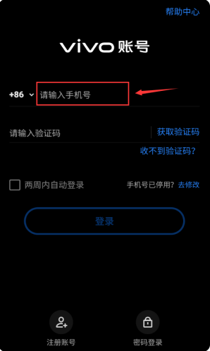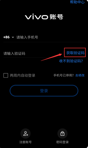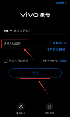 3、将收到的验证码填写进去红框这里,点击登录按钮,完成vivo账号登录。