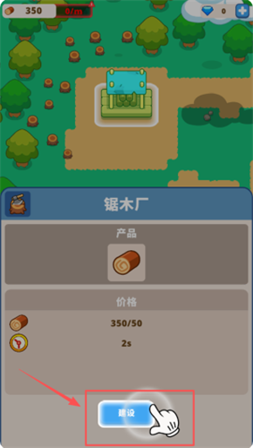 2、想要发展的话记得建造资源建筑。比如找到锯木厂,看清它产原木的价格和生产时间,然后点击蓝色“建设”按钮,等它建好就能持续产出。
