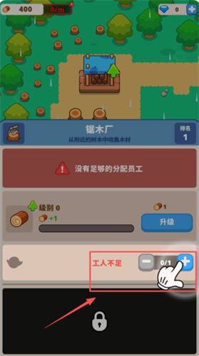 3、建筑运作需要分配工人。在木材厂界面看到“工人不足”的提示时,就需要在右侧点击加号为它增加工人,这样它才能开始收集木材。