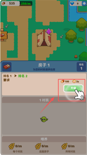 4、多关注各个建筑的升级哦。比如点击房子,能看到升级所需的金币和冷却时间。升级后能提升功能,并注意顶部你的金币和钻石数量。