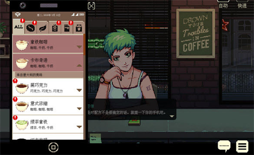 咖啡心语中文版讲诉了大都市时代的咖啡店的生活,叙事表现和人物性格描写十分到位,去完成各种经营的任务,从人道的角度刻画人物的生活,娓娓道来的故事情节也大多温暖人心。去制作各种咖啡来完成游戏中的各种任务,关于冲调咖啡与互诉衷肠的模拟游戏,故事的背景是一个魔幻的架空国际,玩家独自一人运营着一家咖啡厅。在这里人,狼人,吸血鬼,魅魔乃至是外星人之间并不会发起冲突,随着顾客来的次数的添加玩家乃至能听到各个NPC的心里话。