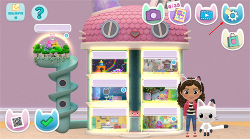 1、在下载并安装好盖比的娃娃屋后打开游戏,首先点击右上角的齿轮。