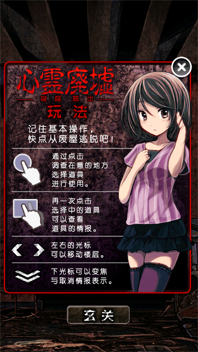 心灵废墟手机版中玩家需要在暗黑色彩的废屋场景中进行点击来寻找各类物品,根据头绪提示选择适宜的物品道具进行解谜,解开谜题后即可推动剧情,尽力和一起被卷进来的少女同伴一同找到逃离这个闹鬼的当地吧。