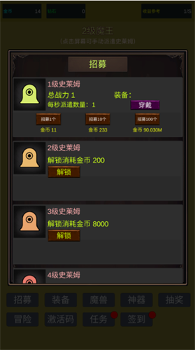 3、在招募界面可以花费金币解锁更高级别的史莱姆。