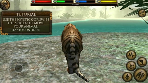 游戏中我们通过屏幕左下角的虚拟腰杆进行走位控制,可以使用右下角的各种按钮来控制动物的攻击和闪躲,这些按钮包括攻击、跳跃、冲锋、怒吼、潜伏等。