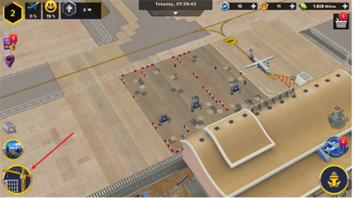 1、进入游戏后,点击左下角的建设按钮,可以自由的去建设机场。